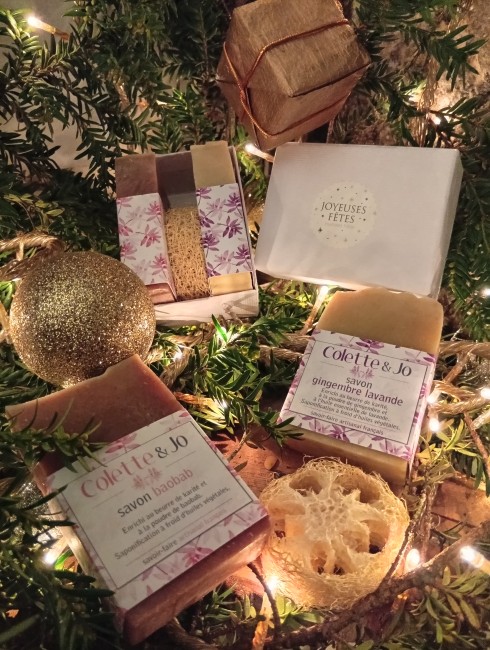 - 2 savons artisanaux : baobab/gingembre-lavande ou café-menthe/cacao miel (poids minimum 90g par savon)